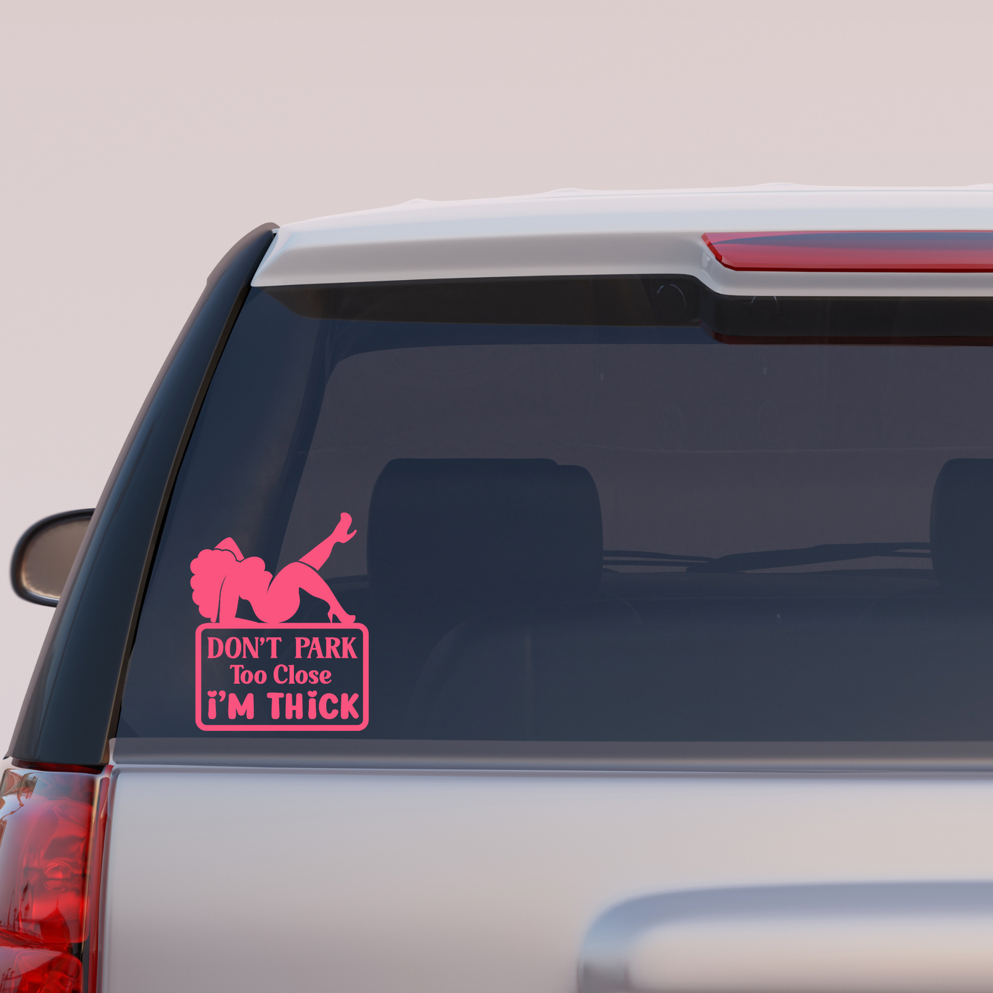 “Don’t park too close, I’m thick” car decal! Semi-permanent sticker car decal. Recommended to stick to glass for easier removal when needed. 6” tall by 4.91” wide