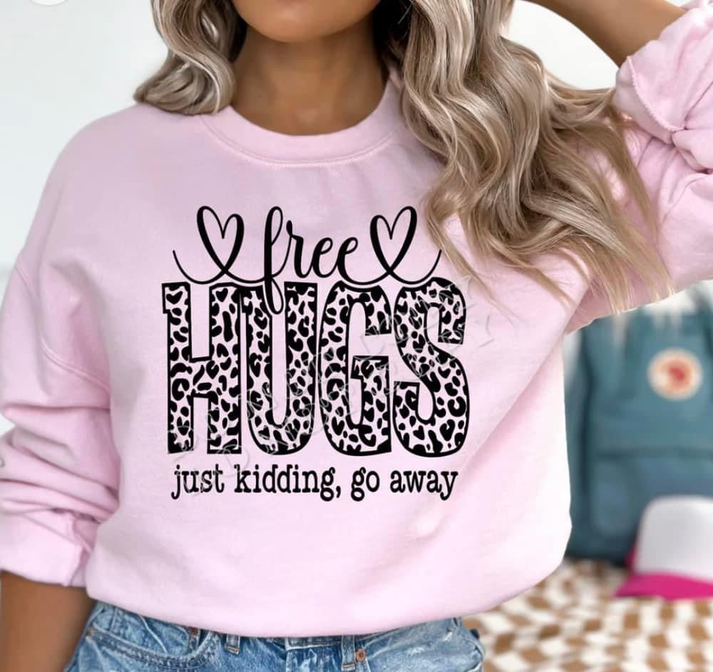 Black screen print available on a variety of different colors. "Free hugs. Just kidding, go away"