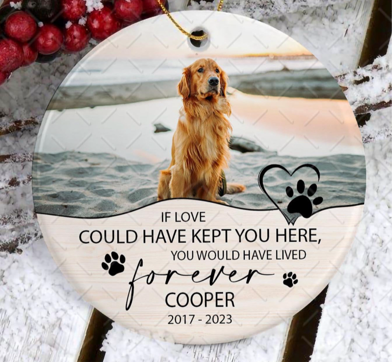 Honor your beloved pet with our Personalized Pet Memorial Ornament. Simply email us the picture, name, and dates to thecutestbuttondesigns@yahoo.com and we'll create a beautiful ceramic ornament with a matching ribbon. A special way to remember your furry friend and keep their memory close to your heart.