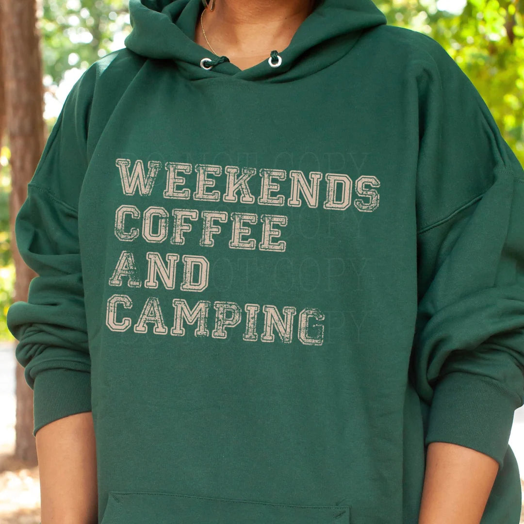 Tan screen print available on a variety of different colors. "Weekends Coffee and Camping"